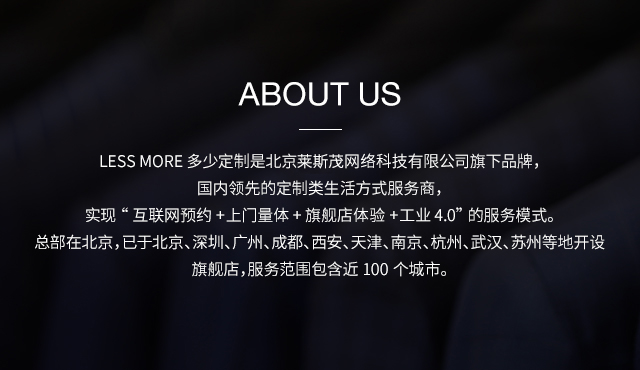 LESS MORE多少定制 2015年5月創(chuàng)立于北京,以互聯(lián)網(wǎng)思維和工業(yè)4.0切入服裝定制領(lǐng)域,獨(dú)創(chuàng)“互聯(lián)網(wǎng)預(yù)約+旗艦店體驗+免費(fèi)上門量體+工業(yè)4.0 C2M生產(chǎn)”的模式,現(xiàn)已成為國內(nèi)服裝定制行業(yè)的標(biāo)桿品牌。